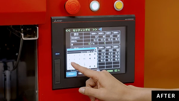 レシピ登録画面で配合ごとにガスバルブの開閉度や使用バーナーの目標温度が設定でき、適切な炉内温度や温度カーブを自動で実現。焼成中のガス圧調整が不要に。