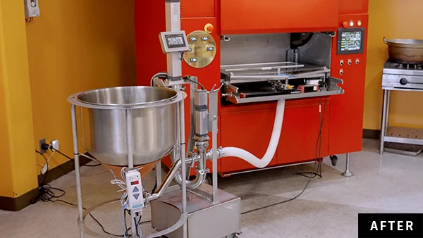 ダメージを与えにくいピストン方式で生地を自動供給し、焼成に集中できる環境へ。生地があふれないよう、生地皿が満水になると通知されるブザー機能も追加。