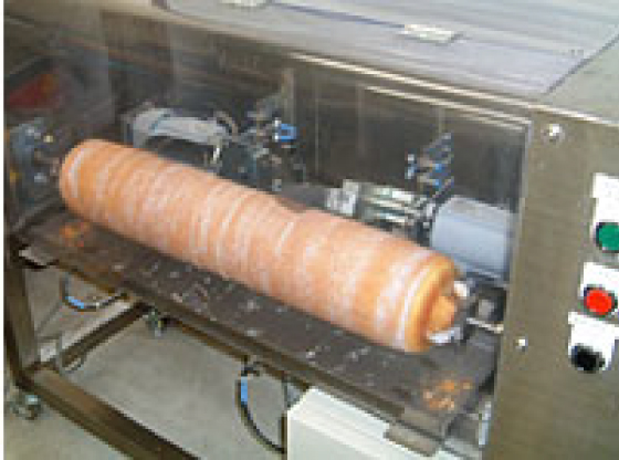 This is required item to cut 1 baking stick of Baumkuchen speedy and correctly. It can make beautiful cut surface comparing the case the operator cut the Baumkuchen by ordinary knife rolling the Baumkuchen by himself. Manual slicer cut the baked Baumkuchen, rolling it and putting the knife one by one. The slicer has scale on the knife moving area, therefore operator can cut in same thickness of sliced Baumkuchen.